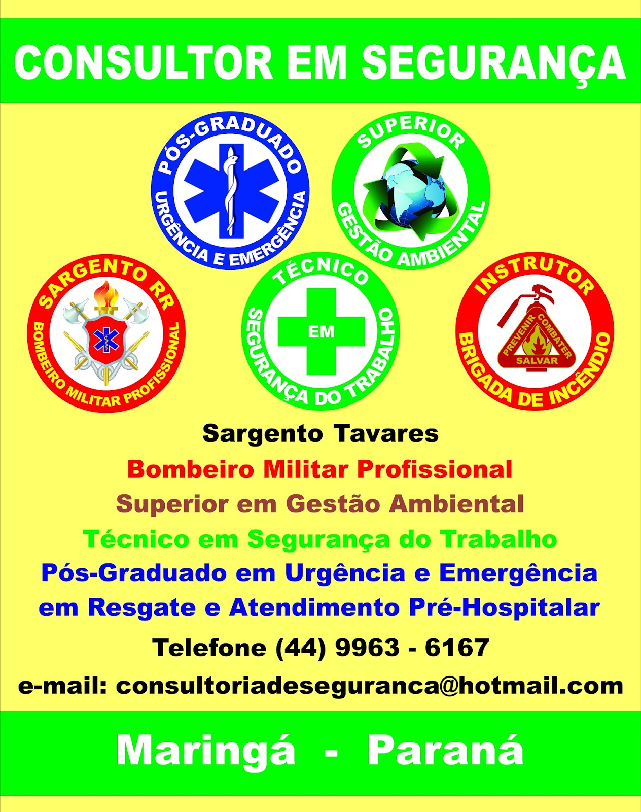 Palestras preventivas e educativas são gratuitas para: CIPA e SIPAT Palestrante: Sargento Tavares Consultor em Segurança do Trabalho Atendendo toda Maringá e Região favor agendar com antecedência Atendemos também: cursos, treinamentos, formações e reciclagens CIPA SIPAT 2019 Maringá e Região CIPA SIPAT 2019 Maringá 2019